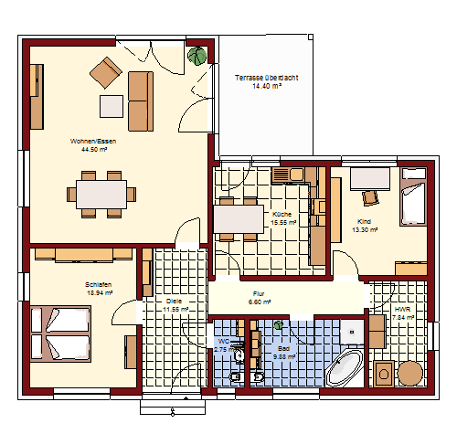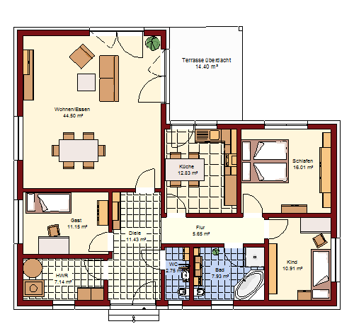 Dieser Winkelbungalow bietet Ihnen viel Raum auf einer Ebene. Sowohl vom Wohnzimmer, als auch von der Küche, gelangen Sie direkt auf Ihre Terrasse. Zusätzlich zu den 2 Schlafzimmern bietet Ihnen dieser Bungalow noch ein Gästezimmer.