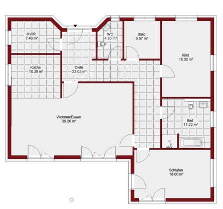 Der Bungalow Wismar ist einer unserer größeren Bungalows. Barrierefrei und mit viel Raum können Sie sich auf einer Ebene zu Hause fühlen. Wir planen mit Ihnen Ihren ganz persönlichen Grundriss, ob 3 oder 4 Zimmer, mit kleiner Abstellkammer, offener Küche, es gibt viele Möglichkeiten, die sich in diesem Bungalow realisieren lassen.
