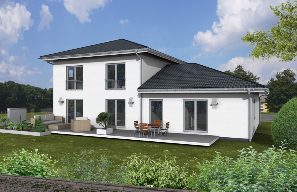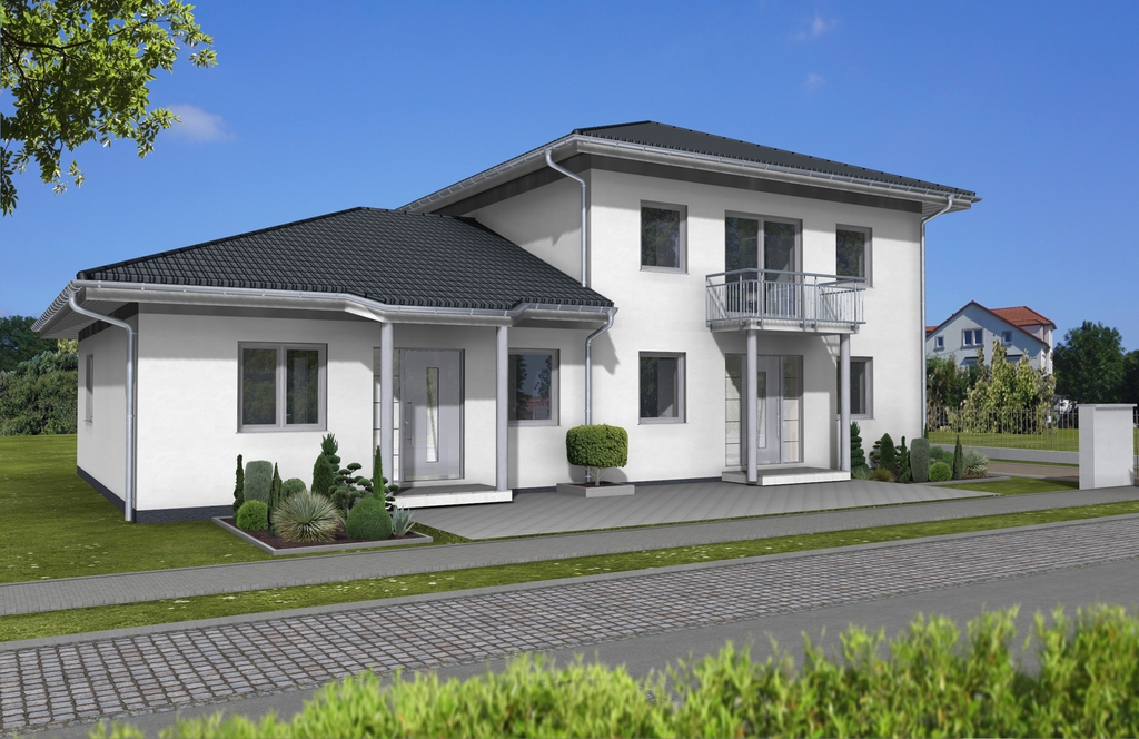 Häuser mit Einliegerwohnungen erfreuen sich zunehmender Beliebtheit, lässt sich doch die Extrawohnung im Eigenheim ganz vielfältig nutzen. Ob zur Vermietung oder wenn mehrere Generationen unter einem Dach leben möchten. Trotzdem kann man sich in seine eigene Wohnung zurückziehen. Die Hauptwohnung erstreckt sich in dieser modern anmutenden Stadtvilla über zwei Etagen. Die Einliegerwohnung ist in einem Anbau im Bungalowstil im Erdgeschoss untergebracht. Jede Wohnung hat ihren separaten Eingang, man kann aber auch innerhalb des Hauses zur jeweils anderen Wohnung gelangen. Die Grundrisse passen wir natürlich an die persönlichen Bedürfnisse an.