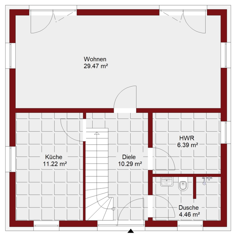 großzügige Wohnbereich zum Verweilen ein. Durch die Terrassentüren gelangt viel Licht in den Raumund man hat einen direkten Zugang zum Garten. Ebenfalls im Erdgeschoss befinden sich ein WC mit Dusche