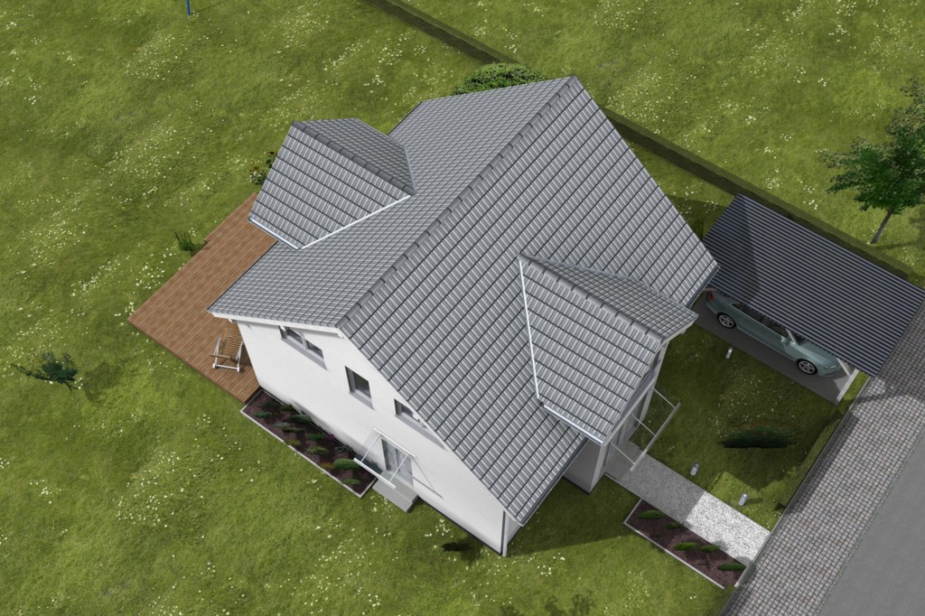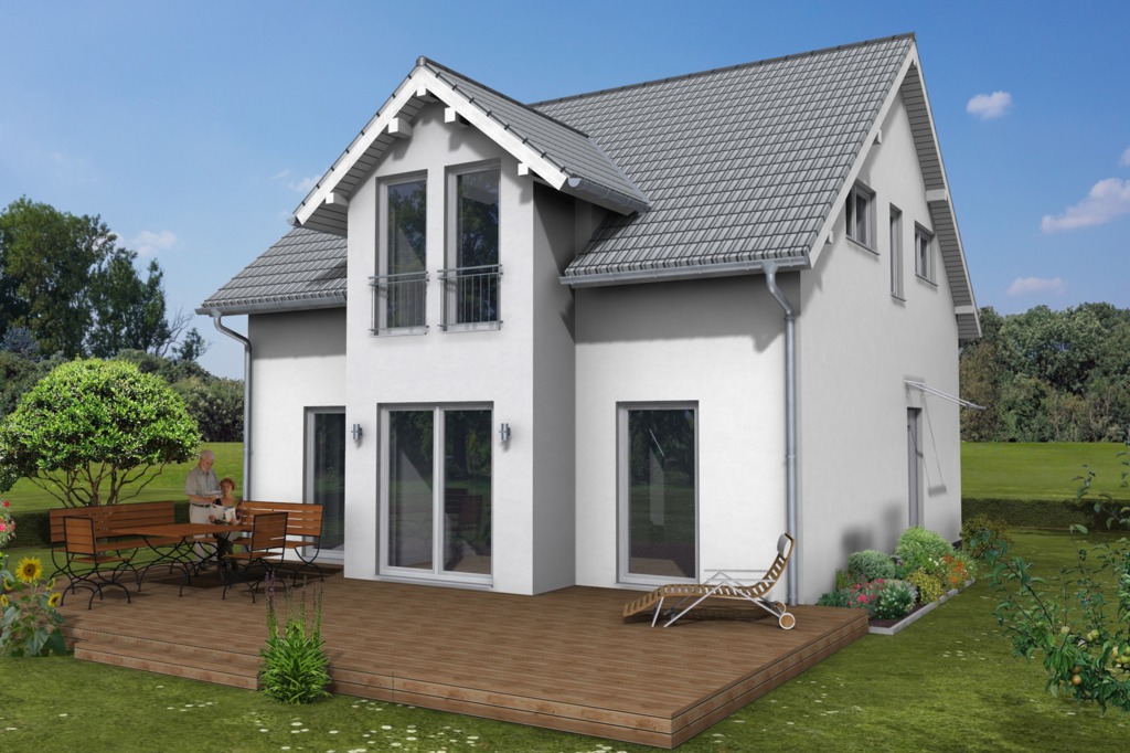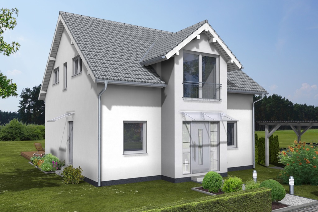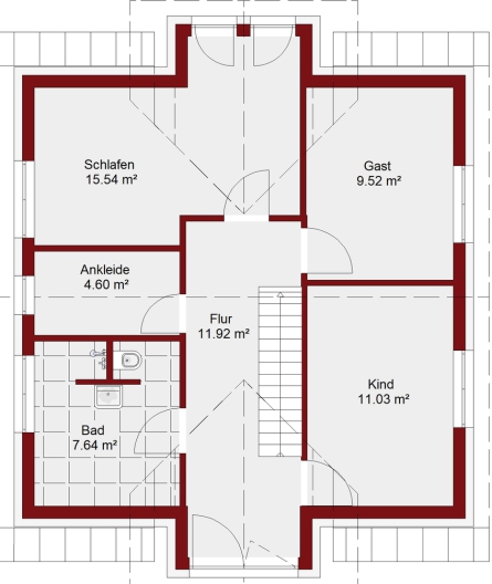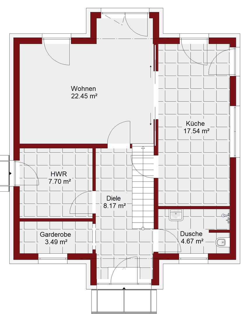In diesem Haus mit seinen vier Giebeln und den großen Fenstern lässt es sich sehr gut leben. Die Aufteilung in unserem Grundriss-Beispiel ist im Erdgeschoss so gestaltet, dass die große Küche durch Schiebetüren zum Wohnzimmer hin geöffnet werden kann. In beiden Geschossen gibt es ausreichend Nebengelass, zum Beispiel einen Raum für Garderobe und Ankleide. Wir passen den Grundriss gerne an Ihre persönlichen Wünsche an.